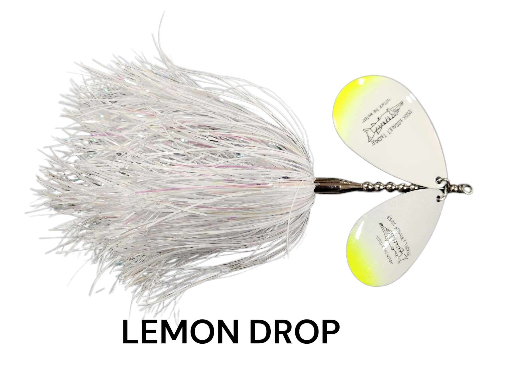 The 109 is a double bladed premium quality bucktail made with only the highest quality components available, brass beads and clevis on stainless steel wire picked to give optimum vibration and durability while still allowing the blades to immediately start up on your retrieve. The 109 incorporates a revolutionary design using two different size blades to create a unique sound profile that drives huge muskies in to a frenzy. Our skirts are a Custom mix of Mylar Skirt Material applied directly to a specially designed weight collar, this allows the skirt and weight to move in unison giving you longer cast and less tumbling without the need of excess weight. All of our bucktails utilize Premium Black Trident Treble Hooks shrink tubed so there in the best hooking position.